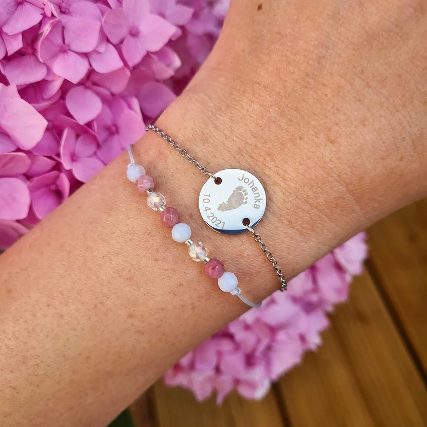Celokovová varianta náramku Birth Day našich personalizovaných náramků s ocelovými medailonky. Na medailonek Vám vygravírujem otisk nožičky či ručiček, jméno, datum narození, případně i hmotnost a délku narozeného miminka. Pokud by se text nevešel, možné je i gravírování z druhé strany přívěsku.