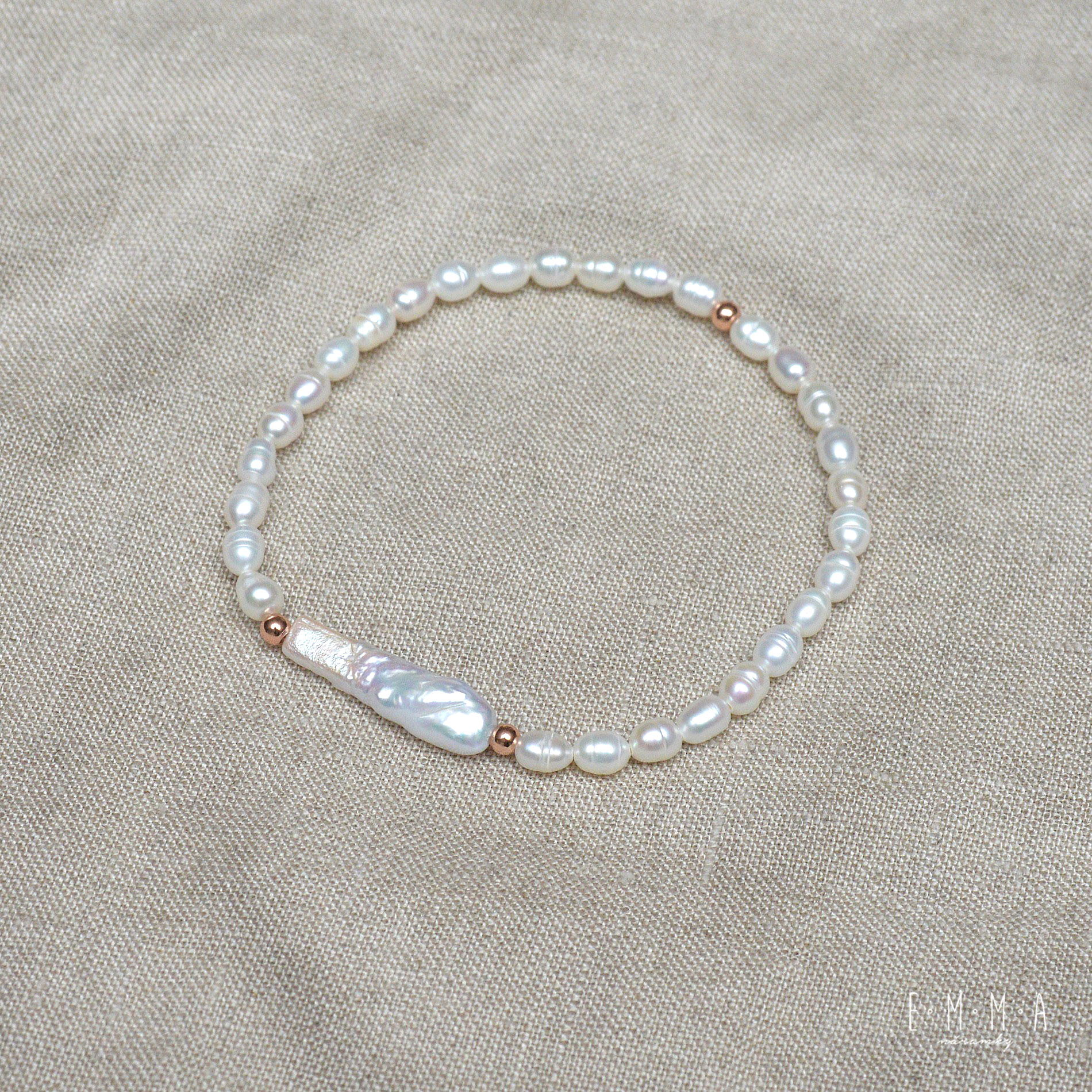 Představujeme vám nový náramek Pearls Line z říčních perel o velikosti 3,5-5 mm a jedné podlouhlejší perly o délce 25 mm. Jedná se o přírodní materiál, korálky mají tedy nepravidelný tvar, díky čemuž je každý kousek originál. Perličky jsou doplněny malými korálky z nerezové oceli. Ve variantách vyberte, prosím, zda mají být ocelové korálky ve stříbrné, zlaté nebo rose gold barvě.